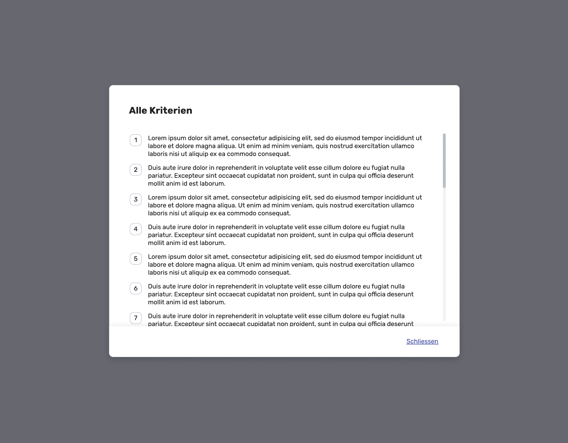 A structured, desktop-first interface based on a clear navigation hierarchy: dossiers, case types, and step-based detail screens.